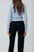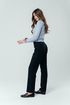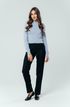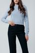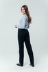 Серо-синие прямые брюки вписываются в деловой дресс-код. Средняя посадка не вызывает нареканий.